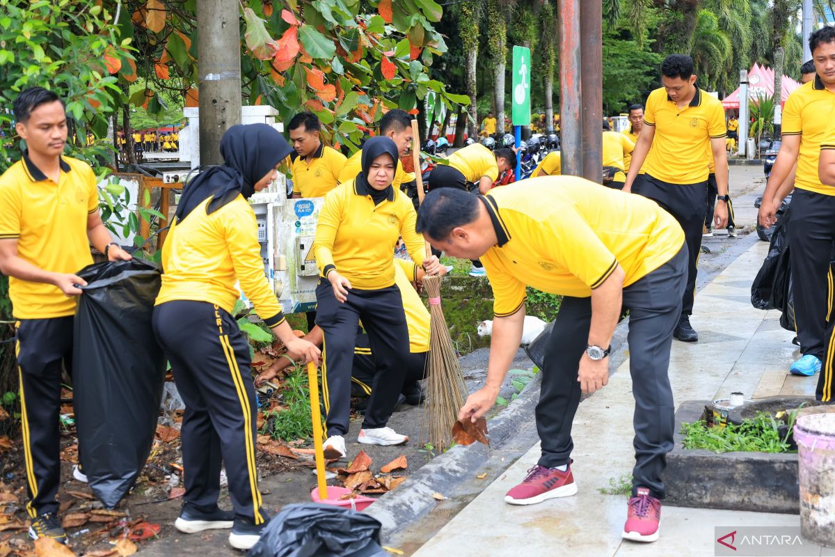 Ribuan personel Polda Bangka Belitung menggelar aksi kerja bakti atau korve di Kawasan Alun-alun Taman Merdeka (ATM) Kota Pangkalpinang, Jumat (6/2/26) pagi.