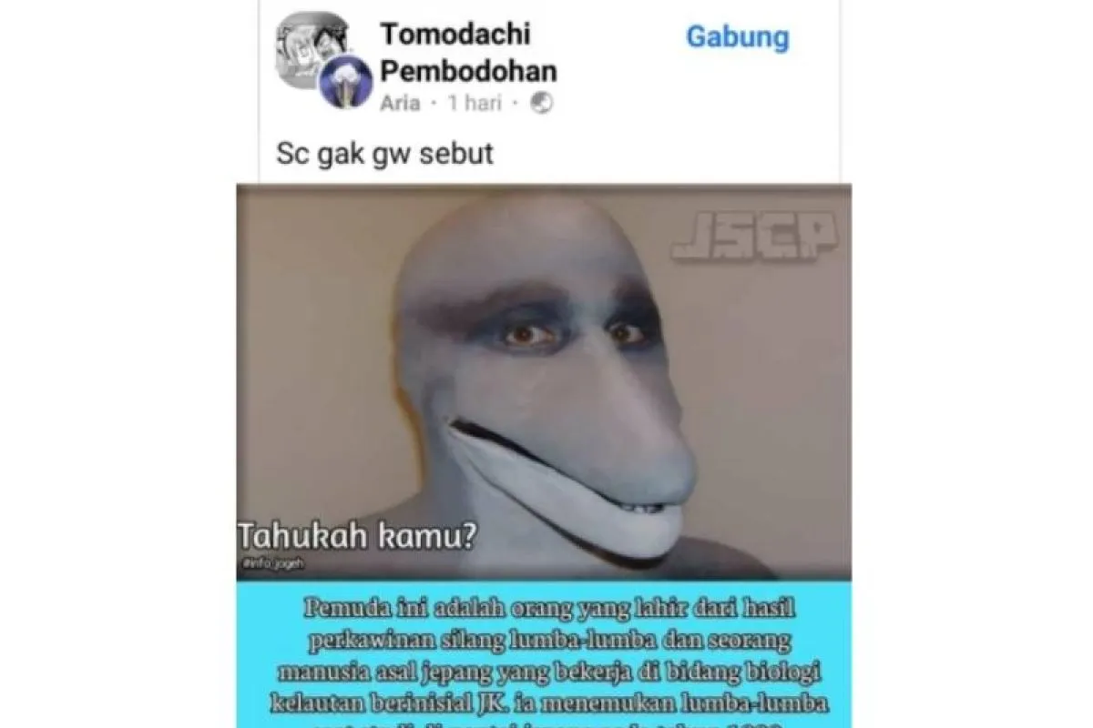 Narasi dalam unggahan itu menyebut manusia jadi-jadian itu merupakan anak hasil perkawinan silang antara lumba-lumba dengan manusia asal Jepang yang bekerja dalam bidang biologi kelautan.