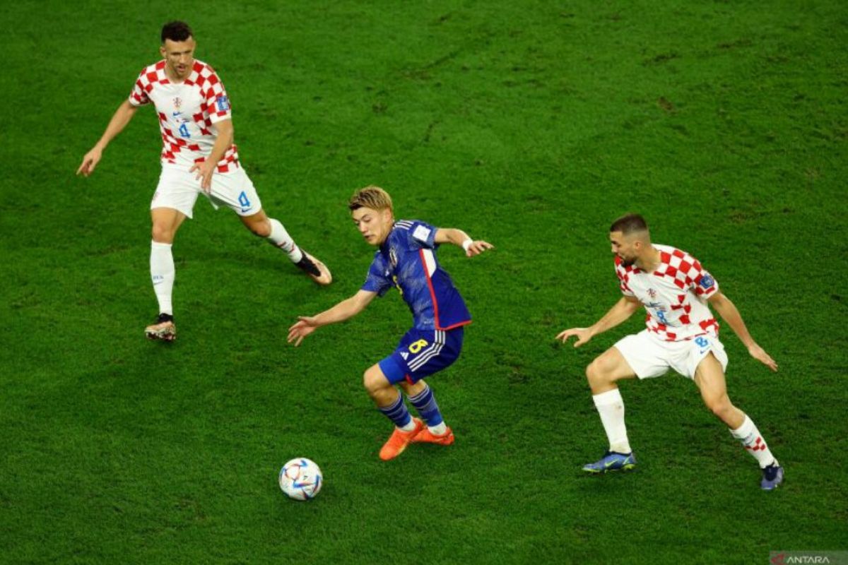 Pesepak bola Jepang Ritsu Doan membawa bola dan dijaga dua pesepak bola Kroasia Mateo Kovacic dan Ivan Perisic dalam laga babak 16 besar Piala Dunia 2022, di Stadion Al Janoub Stadium, Al Wakrah, Qatar. Senin (5/12/2022). ANTARA FOTO/Reuters-Lee Smith/hp.