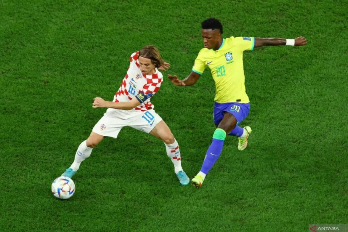 Pesepak bola Kroasia Luka Modric (kiri) berebut bola dengan pesepak bola Btazill Vinicius Junior dalm laga babak perempat final Piala Dunia 2022, di Stadion Education City Stadium, Doha, Qatar, Jumat (9/12/20220. Babak pertama usai Brazil vs Kroasia masih tanpa gol. ANTARA FOTO/Reuters-Lee Smith/hp.