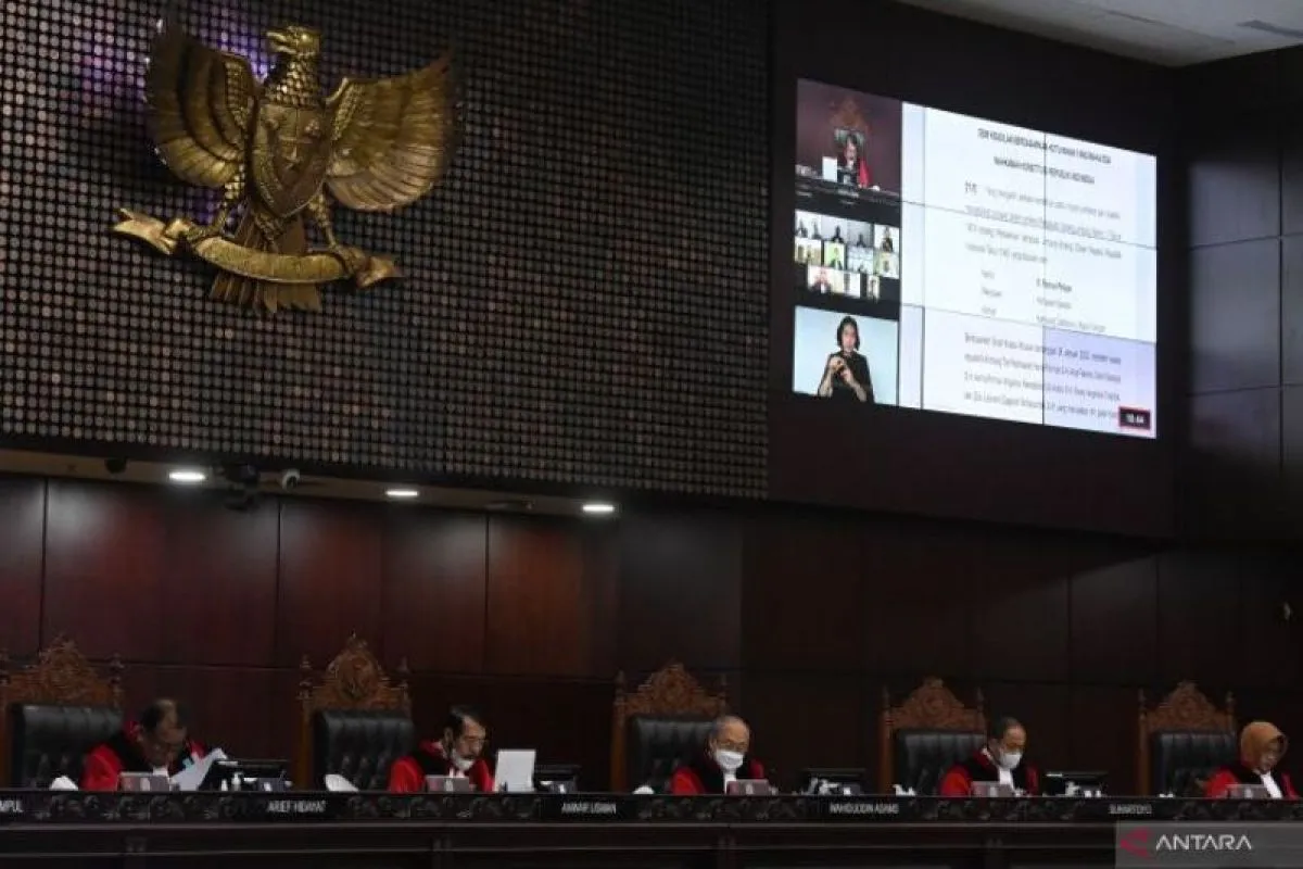 Ketua Majelis Hakim Mahkamah Konstitusi (MK) Anwar Usman (kedua kiri) memimpin jalannya sidang pengujian materiil UU Nomor 1 Tahun 1974 tentang Perkawinan dengan agenda pembacaan amar putusan di Gedung Mahkamah Konstitusi, Jakarta, Selasa (31/1/2023). Ketua Majelis Hakim Mahkamah Konstitusi dalam amar putusannya menolak permohonan uji materiil Pasal 2 ayat 1 UU Nomor 1 Tahun 1974 tentang Perkawinan terkait pernikahan beda agama yang diajukan pemohon Ramos Petege, seorang Katolik yang hendak menikahi seorang perempuan beragama Islam. ANTARA FOTO/Indrianto Eko Suwarso/foc.