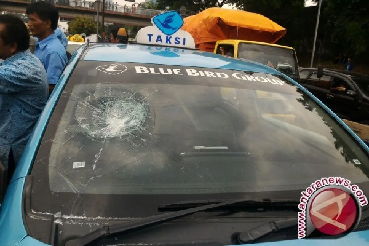 Sekitar pukul 11.00 WIB satu unit taksi Bluebird dihentikan bahkan hingga pecah kaca bagian depan dan rusak pada bagian jendela penumpang sebelah kiri.