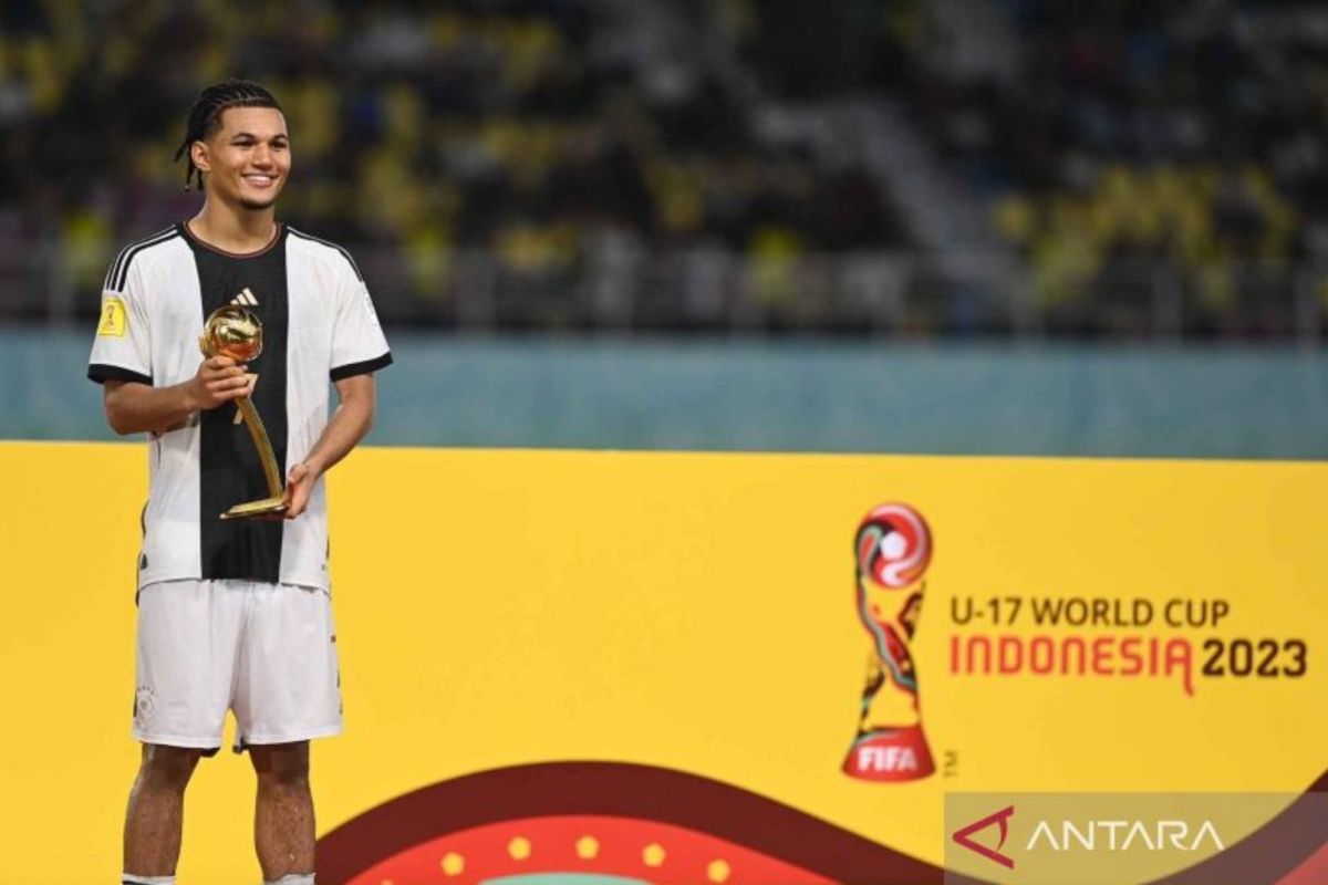 Pesepak bola Timnas Jerman Brunner Paris menerima penghargaan pemain terbaik Piala Dunia U-17 2023 di Stadion Manahan, Solo, Jawa Tengah, Sabtu (2/12/2023). ANTARA FOTO/Mohammad Ayudha/YU