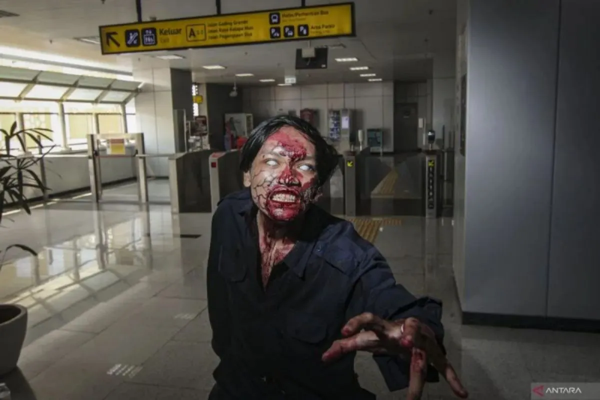 Aktor beraksi menakuti penumpang Lintas Raya Terpadu (LRT) Jakarta pada Pandora Box Artmire Festival 2024 di Stasiun LRT Pegangsaan Dua, Jakarta, Sabtu (13/7/2024). PT LRT Jakarta berkolaborasi dengan Pandora Box menghadirkan wahana zombie bertema Train to Apocalypse: No Way Out untuk meningkatkan minat masyarakat menggunakan moda transportasi LRT yang berlangsung selama 45 hari hingga 18 Agustus 2024. ANTARA FOTO/Dhemas Reviyanto/foc.
