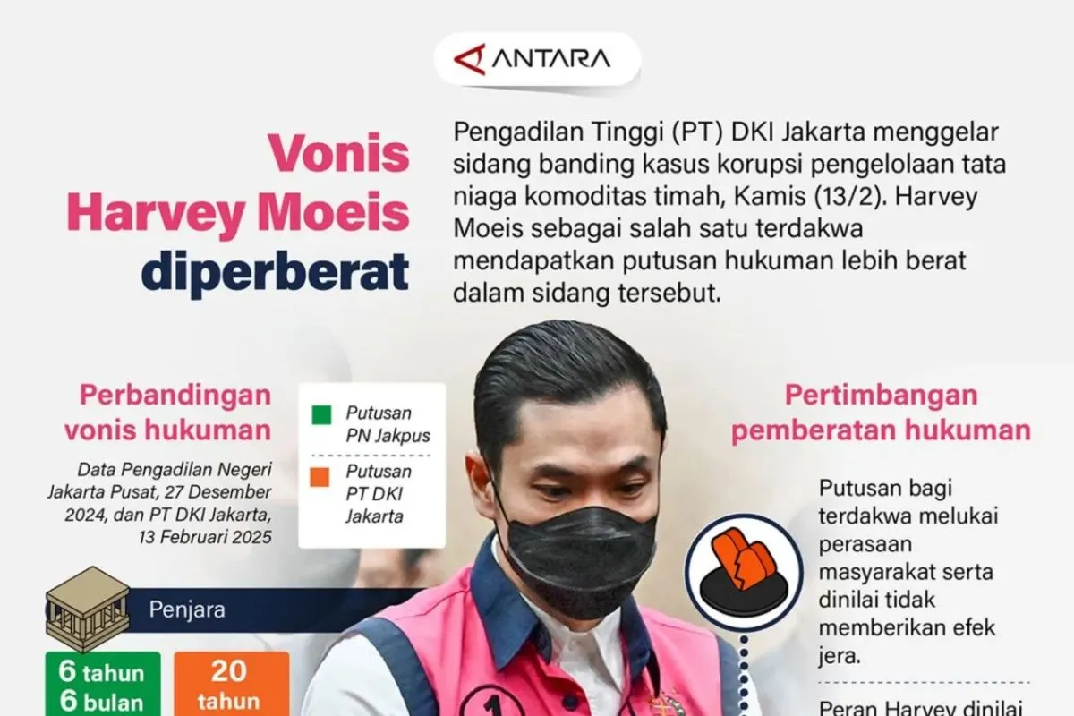 Pengadilan Tinggi (PT) DKI Jakarta menggelar sidang banding kasus korupsi pengelolaan tata niaga komoditas timah, Kamis (13/2). Harvey Moeis sebagai salah satu terdakwa mendapatkan putusan hukuman lebih berat dalam sidang tersebut.