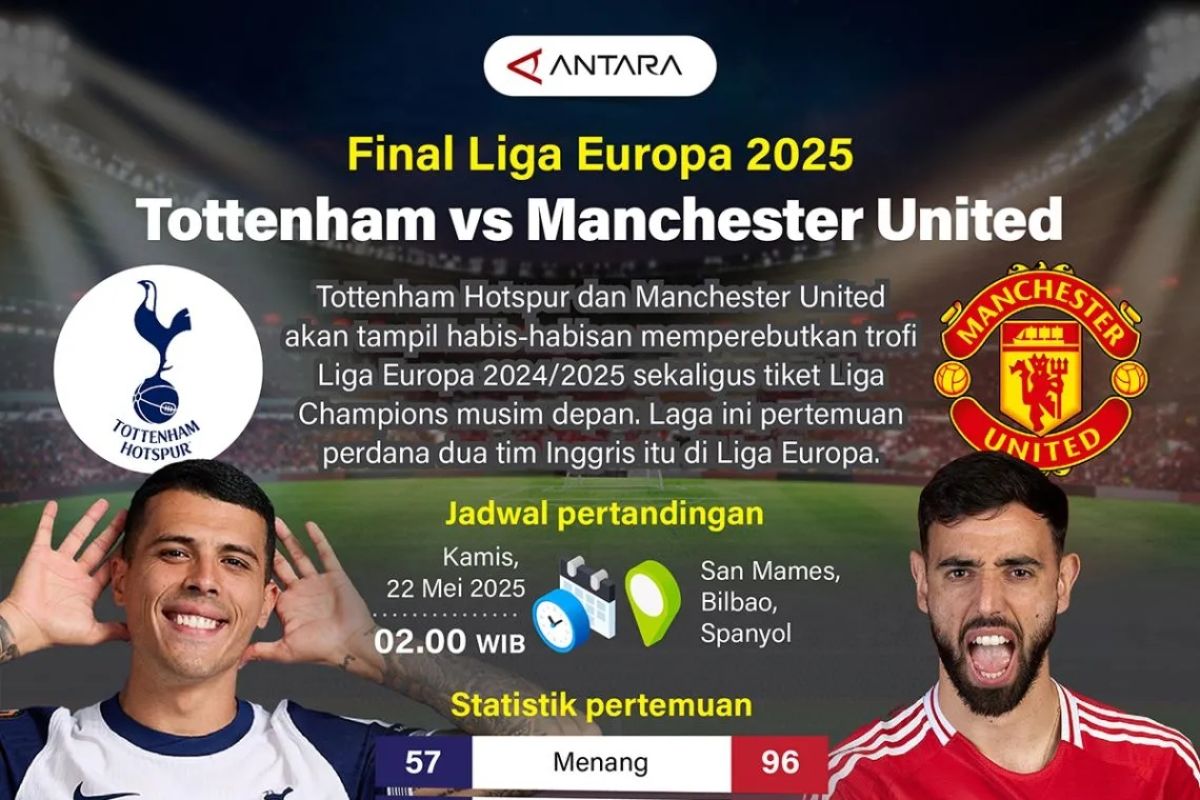 Tottenham Hotspur dan Manchester United akan tampil habis-habisan memperebutkan trofi Liga Europa 2024/2025 sekaligus tiket Liga Champions musim depan. Laga ini pertemuan perdana dua tim Inggris itu di Liga Europa.