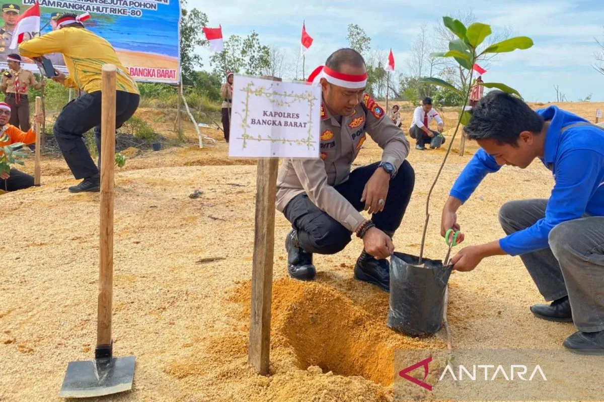 "Pada momentum perayaan HUT Ke-80 RI ini kami laksanakan penanaman bibit pohon jambu mete, petai, alpukat, dan cempedak di lahan kritis bekas tambang bijih timah," kata Kapolres Bangka Barat AKBP Pradana Aditya Nugraha di Mentok, Jumat.