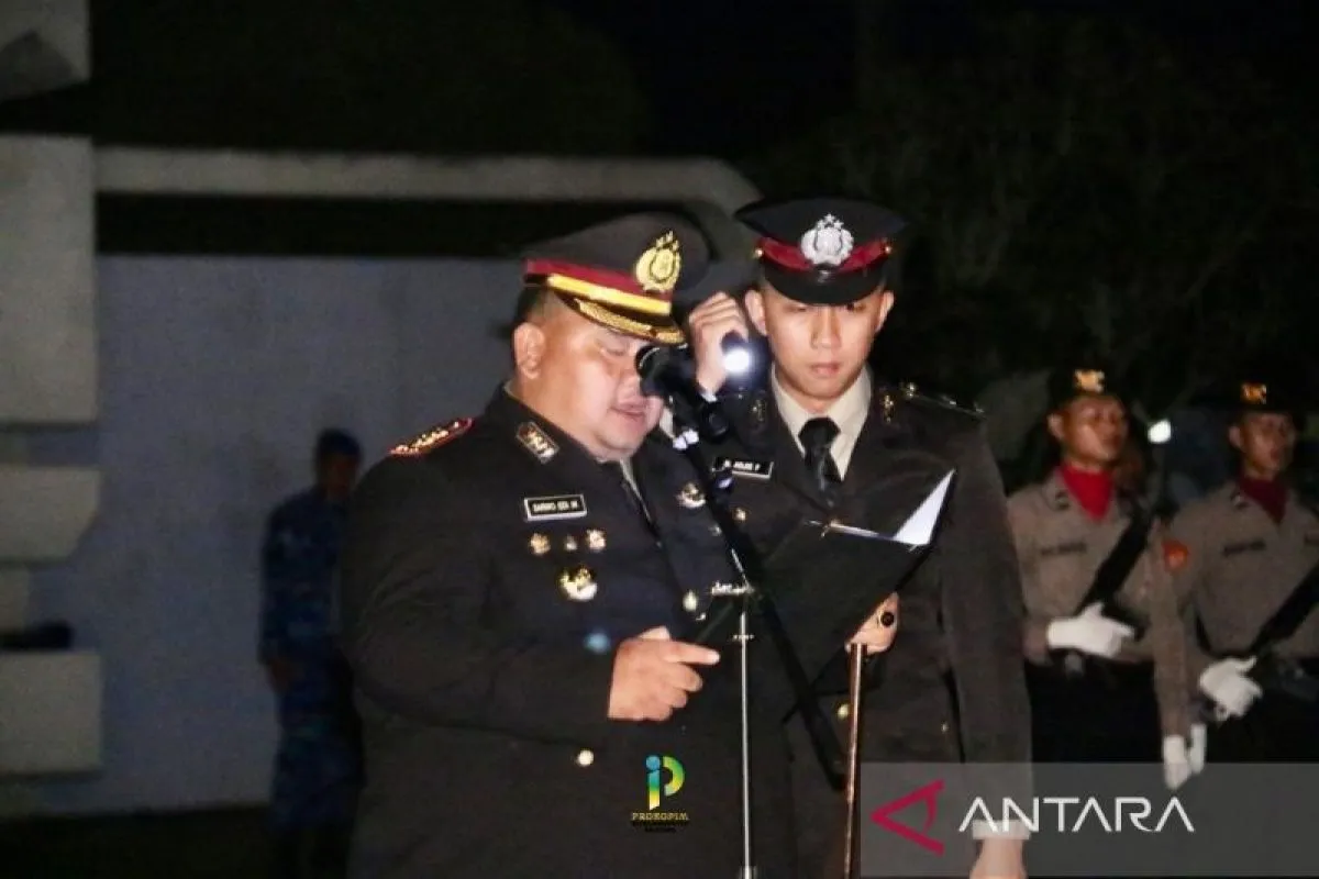 Belitung (ANTARA) - Kapolres Belitung, Polda Provinsi Kepulauan Bangka Belitung, AKBP Sarwo Edhie Wibowo memimpin jalannya apel kehormatan dan renungan suci di Taman Makam Pahlawan (TMP) Ksatria Tumbang Ganti dalam rangka memperingati HUT ke-80 RI, Minggu pukul 00.01 WIB.