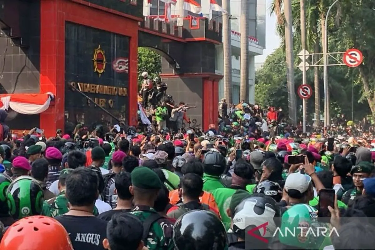 Meski sempat berdialog dan mundur sejenak, ratusan massa yang terdiri dari warga dan pengemudi ojek online (ojol) itu kembali melanjutkan aksi dan menyampaikan aspirasi mereka.