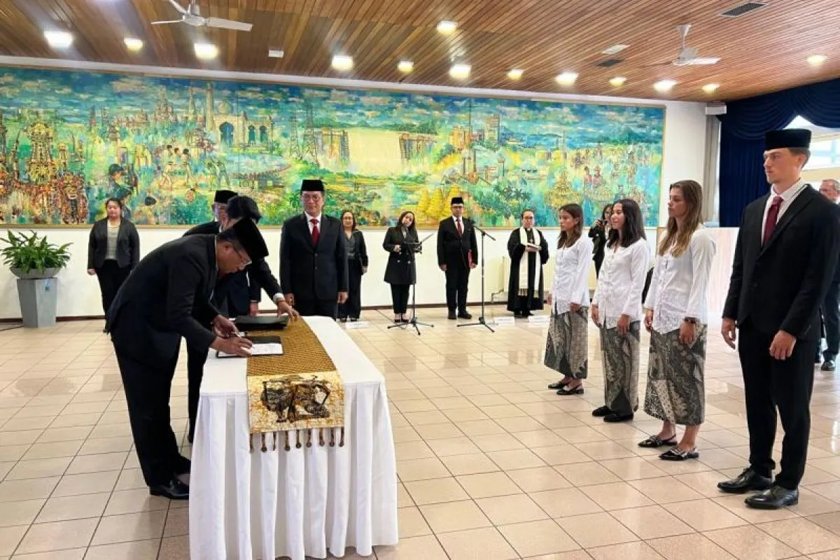 Menteri Hukum Republik Indonesia (Menkum RI), Dr. Supratman Andi Agtas yang didampingi Sekretaris Jenderal Kementerian Hukum, Nico Afinta dan Duta Besar Indonesia Luar Biasa Berkuasa Penuh untuk Belanda, Mayerfas, resmi melakukan pengambilan sumpah dan janji setia pewarganegaraan yang berlangsung di Den Haag, Jumat (29/8).