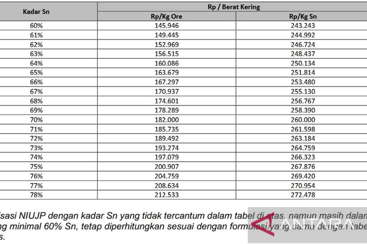 Pangkalpinang (ANTARA) - PT Timah Tbk mengumumkan penetapan nilai imbal jasa usaha penambangan (NIUJP) kerja sama penambangan program kemitraan dan kerja sama penambangan timah alluvial berdasarkan kadar Sn di Pangkalpinang, Kamis (2/9/2025).