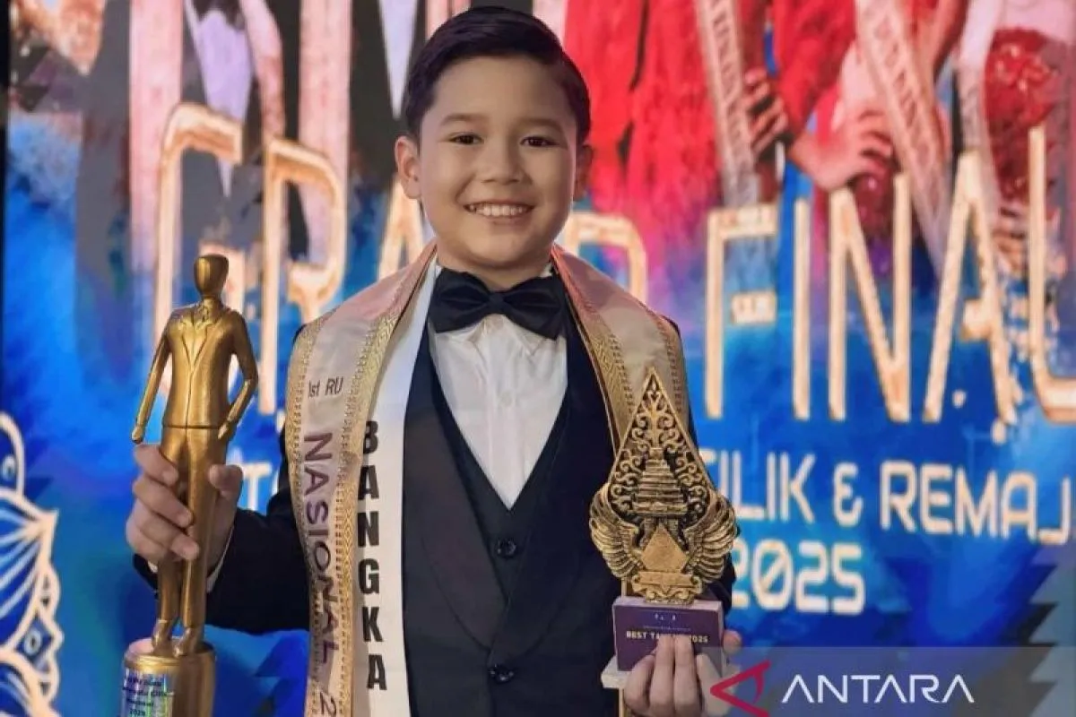 Pangkalpinang (ANTARA) - Azzam Pradipta, siswa SD Negeri 28 Pangkalpinang, Provinsi Kepulauan Bangka Belitung, berhasil meraih gelar Runner-Up 1 Duta Pariwisata Cilik Nasional 2025 dan penghargaan Best Talent dalam ajang nasional yang digelar di Jakarta.
