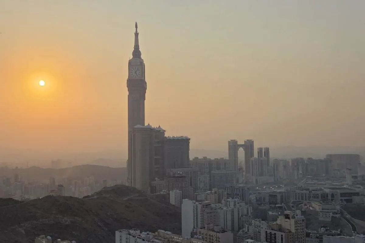 Sementara menara Abraj Al-Bait, atau yang dikenal sebagai Zamzam Tower, berdiri megah seolah menatap langsung sang surya yang perlahan tenggelam.
