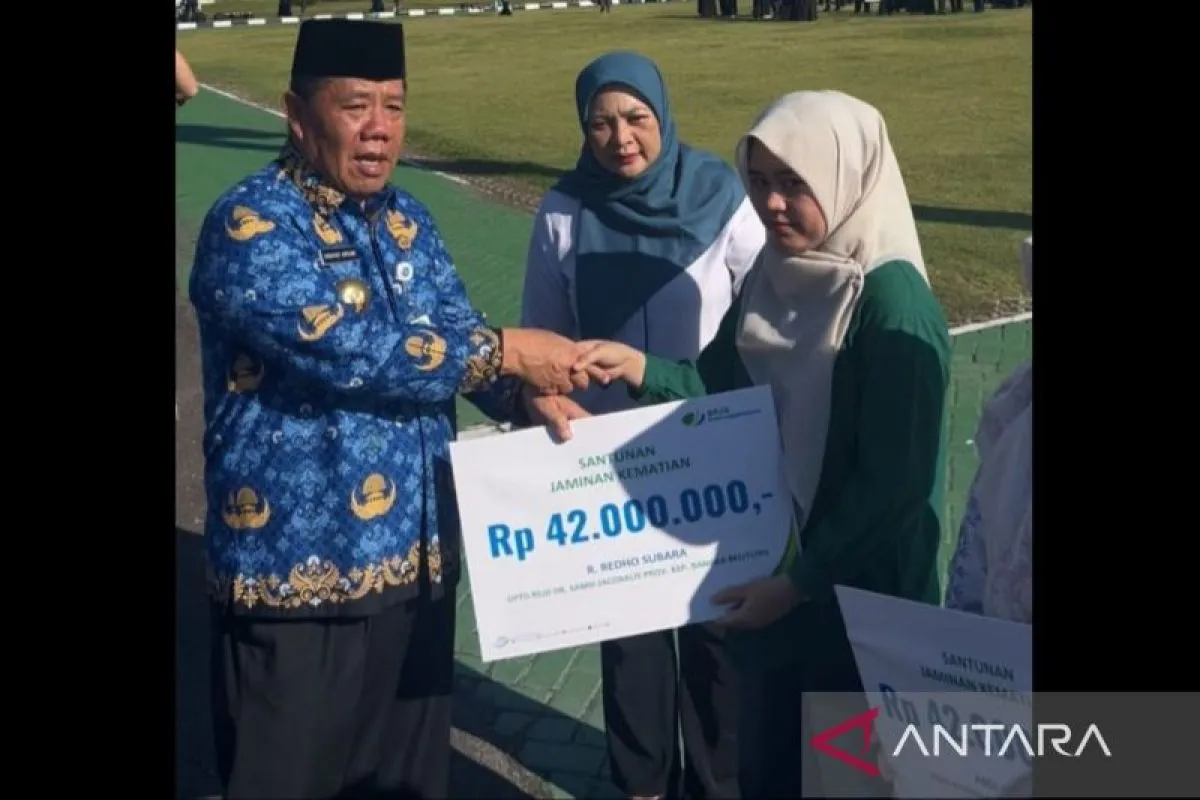Pangkalpinang (ANTARA) - BPJS Ketenagakerjaan (BPJAMSOSTEK) menyerahkan santunan kematian sebesar Rp42 juta kepada dua ahli waris anggota KORPRI Provinsi Kepulauan Bangka Belitung pada peringatan HUT KORPRI ke-54 Tahun 2025 di halaman Kantor Gubernur Kepulauan Babel, Senin (1/12).