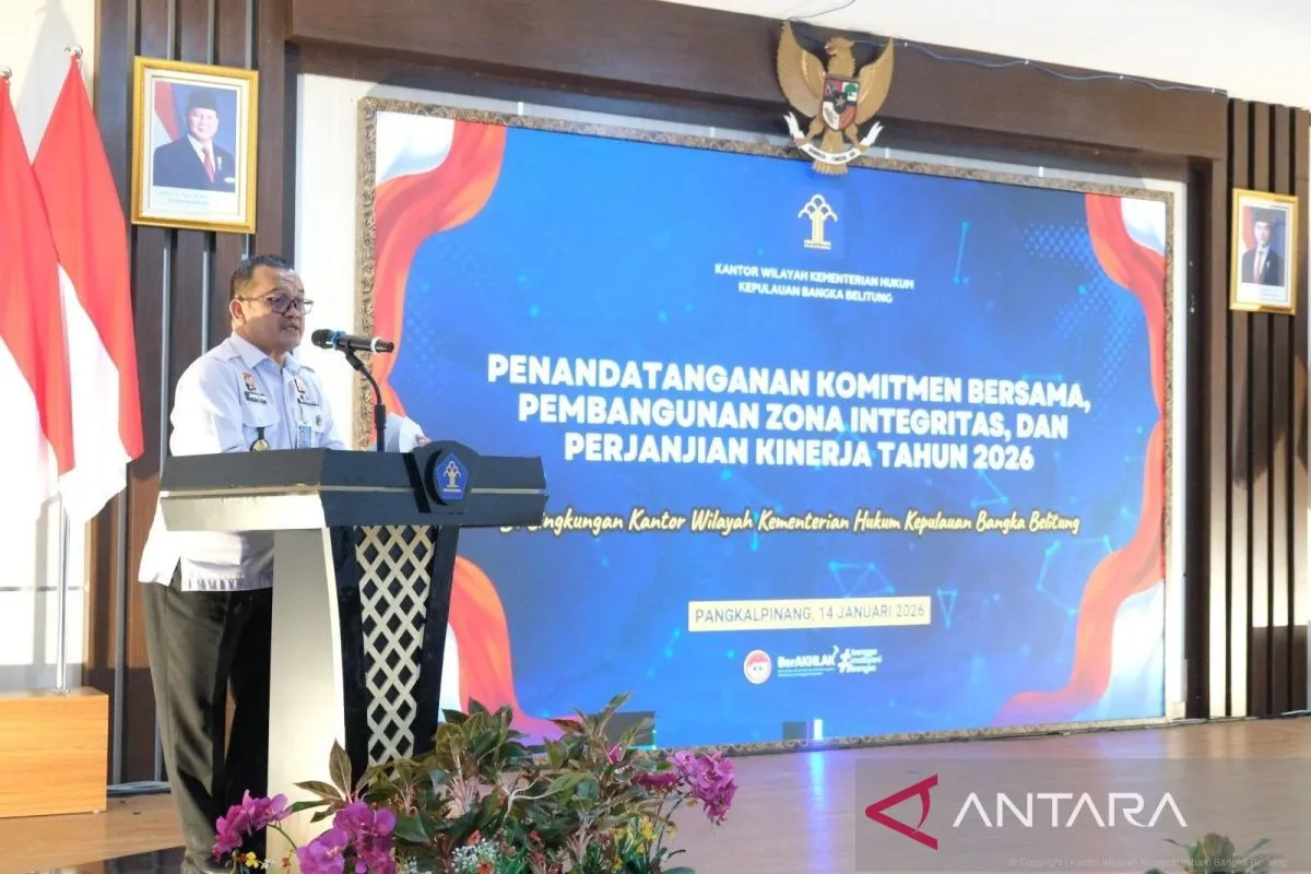 Pangkalpinang (ANTARA) - Kantor Wilayah Kementerian Hukum Kepulauan Bangka Belitung mencanangkan pembangunan Zona Integritas (ZI) menuju Wilayah Birokrasi Bersih dan Melayani (WBBM) Tahun 2026 melalui penandatanganan Komitmen Bersama, Pakta Integritas, dan Perjanjian Kinerja di Balai Pengayoman Kanwil Kemenkum Babel, Rabu (14/1).