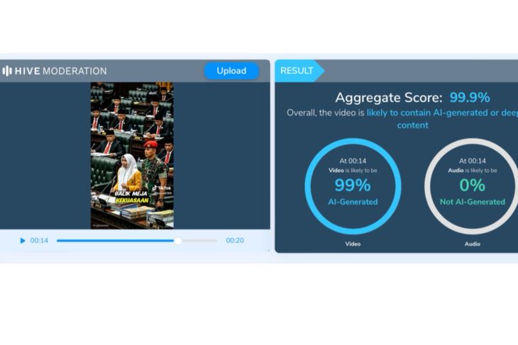 Pemeriksaan menggunakan AI Detector Hive Moderation juga menunjukkan bahwa video tersebut terindikasi 99,9 persen merupakan hasil kecerdasan buatan (AI).