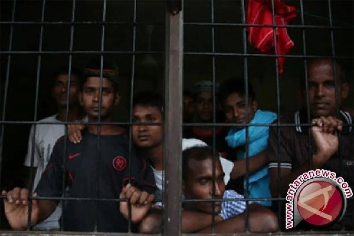 Imigran illegal suku Rohingya asal Bangladesh di tempat penampungan milik Imigrasi di perbatasan Kota Lhokseumawe dan Aceh Utara, Kecamatan Blang Mangat, Aceh, Jumat (22/5). Sebanyak 238 imigran illegal yang terdampar di perairan Aceh Utara menunggu proses deportasi pasca kunjungan Dubes Bangladesh untuk melihat imigran di wilayah Aceh beberapa hari lalu. (ANTARA FOTO/Irwansyah Putra)