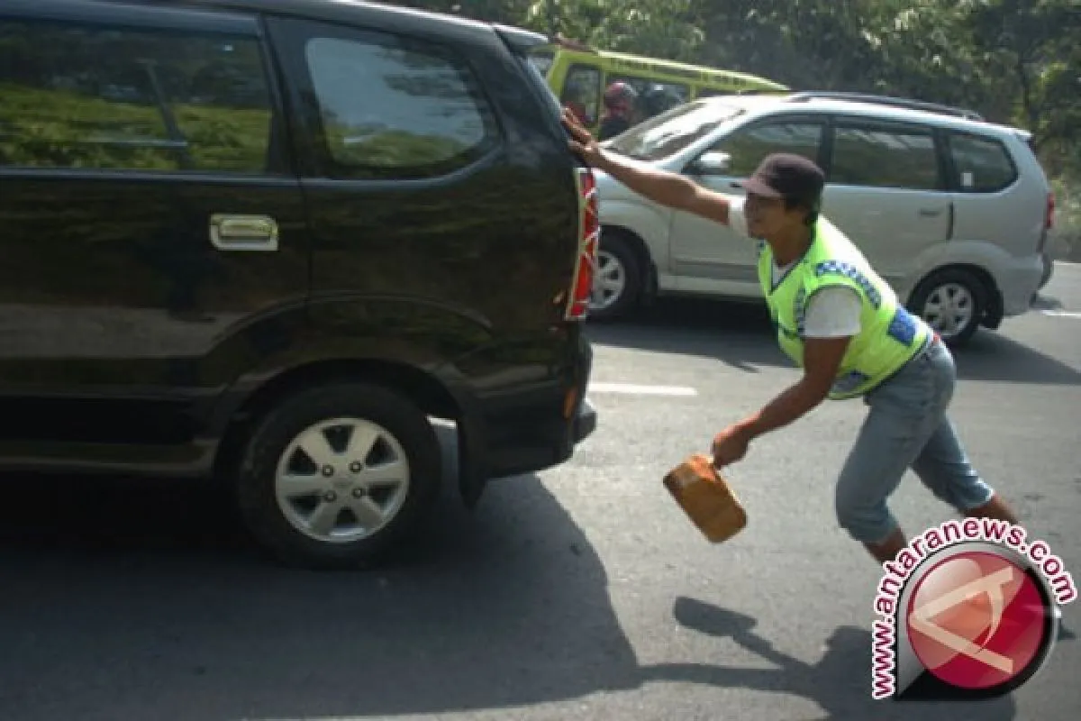 Penjaja jasa ganjal ban mobil mendorong kendaraan pemudik di tanjakan Lingkar Gentong, Tasikmalaya, Jawa Barat, Senin (20/7). Penjaja jasa ganjal ban memanfaatkan kondisi tanjakan curam di kawasan Gentong yang membuat sebagian kendaaran pemudik tidak kuat menanjak sehingga harus diganjal dengan kayu. ANTARA FOTO/Adeng Bustomi