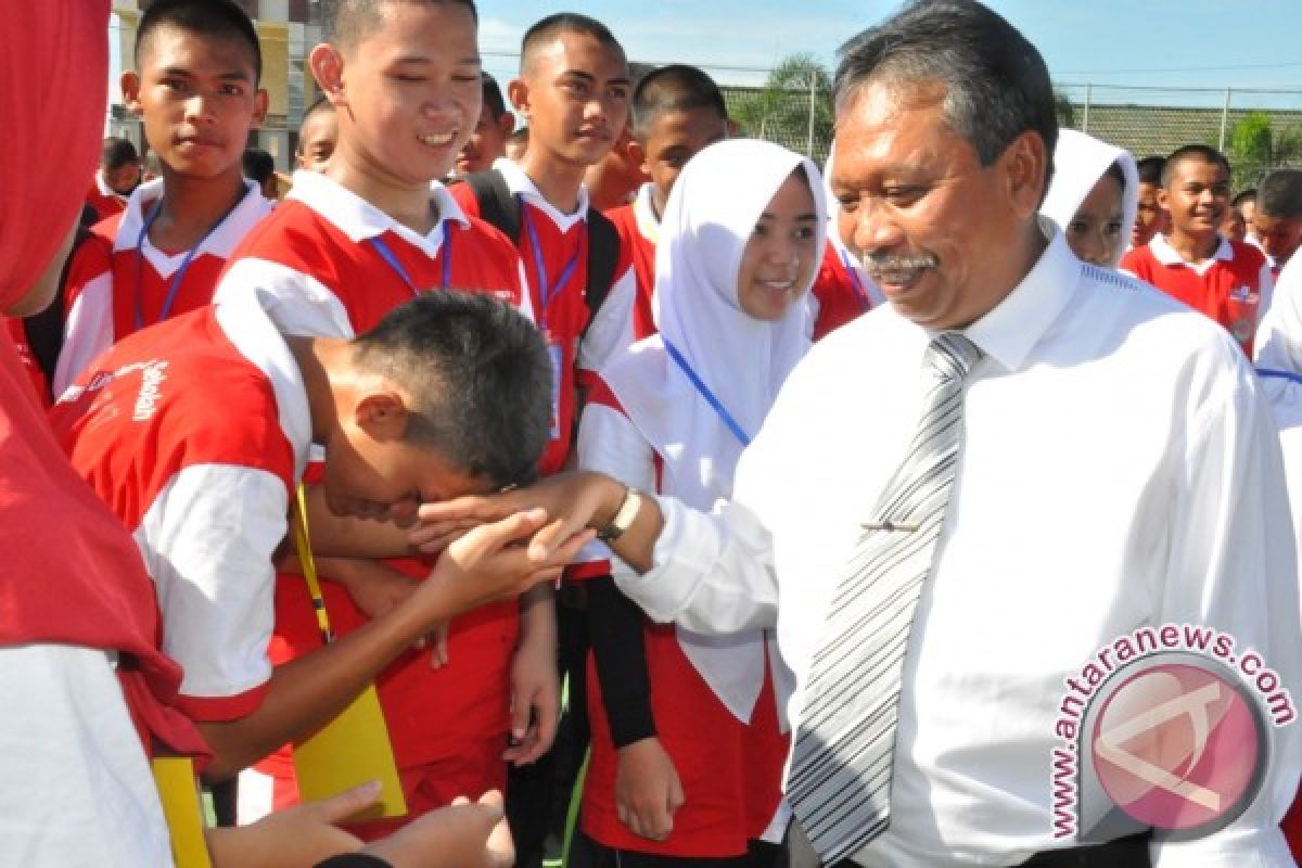 1Gubernur Kepulauan Bangka Belitung Rustam Effendi bersalaman dengan para siswa saat memantau hari pertama anak masuk sekolah untuk memastikan tidak ada kegiatan Masa Orientasi Siswa (MOS) dan tindakan perpeloncoan di daerah itu. (Foto Antara/ Elza)