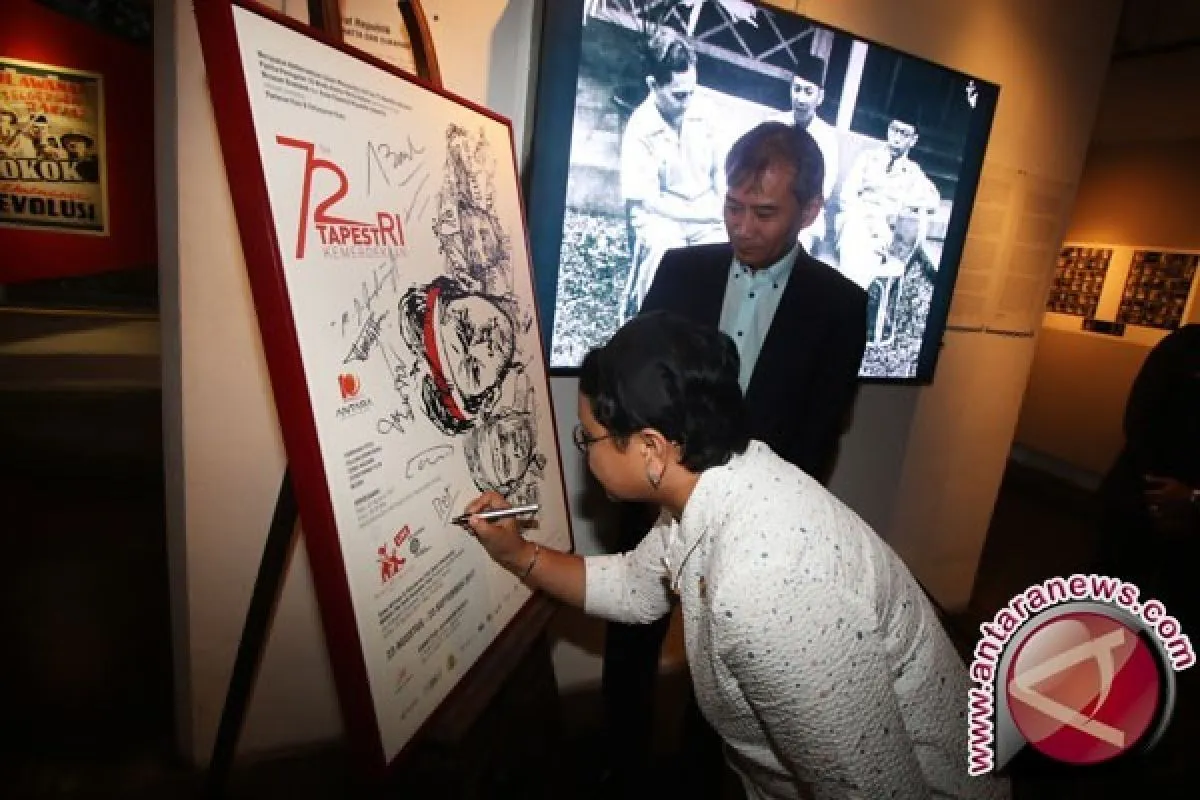 1Menteri Luar Negeri Retno LP Marsudi (depan) disaksikan Direktur Utama Perum LKBN Antara Meidyatama Suryodiningrat (belakang) menandatangani poster pameran foto 72 Tapest RI Kemerdekaan saat melakukan kunjungan ke LKBN Antara di Jakarta, Rabu (13/9/2017). Dalam kunjungan tersebut menteri luar negeri menjelaskan isu-isu terkini yang terjadi di Indonesia dan negara-negara tetangga. (ANTARA FOTO/Rivan Awal Lingga)