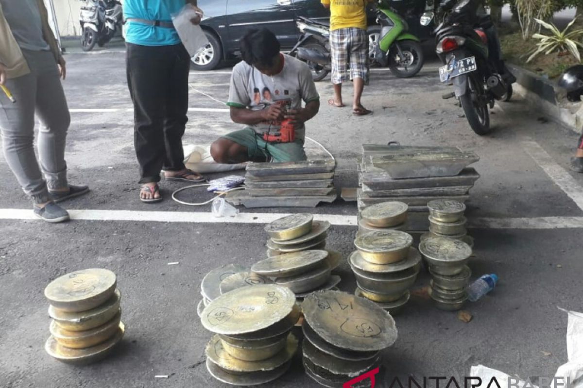 Adapun barang bukti yang berhasil diamankan berupa balok timah persegi berbagai ukuran sebanyak 157 batang dengan berat mulai dari belasan hingga 20 kilogram lebih dan 50 balok berupa lempengan setengah bola.