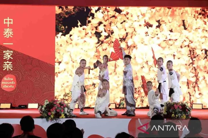 Penampil membawakan seni bela diri di pusat perbelanjaan Siam Paragon, Bangkok, Thailand, Sabtu (14/2/2026). ANTARA FOTO/Xinhua/Sun Weitong/rwa.