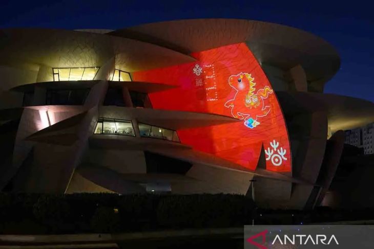 Museum Nasional Qatar memantulkan gambar bertema kuda api dalam rangka perayaan tahun baru Imlek di Doha, Qatar, Senin (16/2/2026). ANTARA FOTO/Xinhua/Nikku/rwa.