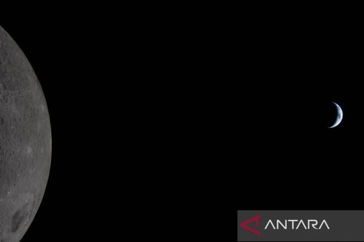 Foto yang diambil pada 6 April 2026 menunjukkan Bulan (depan) dan Bumi yang dilihat dari pesawat ruang angkasa Orion. ANTARA FOTO/NASA/Handout via Xinhua/tom.