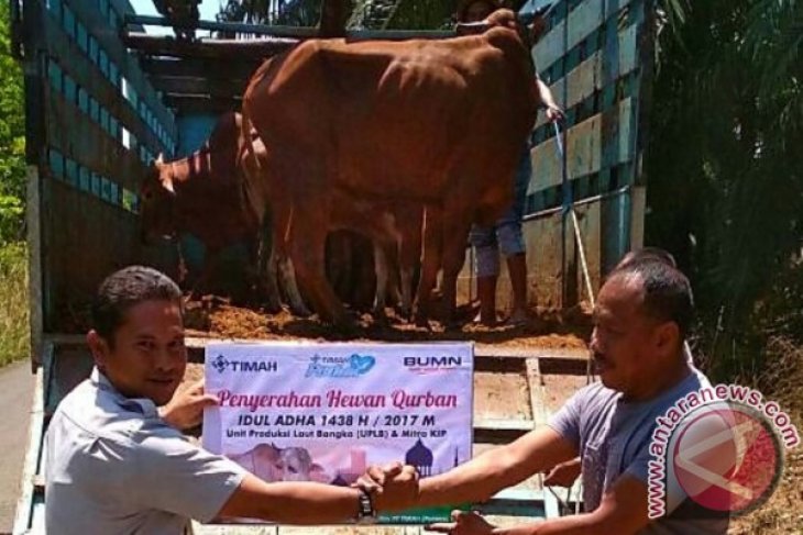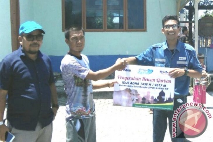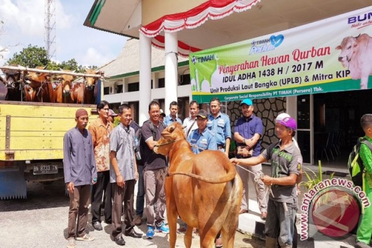 Unit Produksi Laut Bangka (UPLB) dan Mitra KIP PT Timah (Persero) Tbk saat menyerahkan hewan kurban pada Perayaan Idul Adha 1438 H di Pangkalpinang, Sabtu (2/9/2017). (antarababel.com/Aprionis)