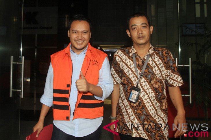 Tersangka penyuap Bupati nonaktif Lampung Selatan Zainudin Hasan, Gilang Ramadhan (kiri), berjalan menuju mobil tahanan seusai menjalani pemeriksaan di gedung KPK, Jakarta, Jumat (10/8/2018). Gilang Ramadhan diperiksa sebagai tersangka terkait suap proyek infrastruktur di kawasan Lampung Selatan. (ANTARA FOTO/Reno Esnir)